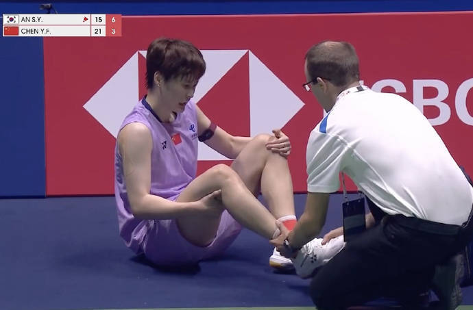 这场比赛第一局陈雨菲参加景象更快,放得更开,参加中局之后主动出击,打得更为积极,一直压制安洗莹,21比15先胜,欣喜了士气。第二局安洗莹不再敢托大,初始拼尽全力,她很快获取了6比3的向上。此时陈雨菲在救球时出现小偶而,右脚踝有些扭伤,比赛中断约5分钟,队医入场进行防碍冰敷和包扎贬责。不雅众席上为陈雨菲捧场的中国球迷心中齐合手了一把汗。好在问题不大,陈雨菲坚决回到赛场,况兼表率和心态不乱,莫得受到任何影响,很快将比分哀吊11平。